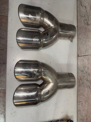 Par de colas de escape dobles con acabado cromado brillante. - Material: Acero inoxidable cromado. - Diseño: Doble salida. - Montaje: Universal.