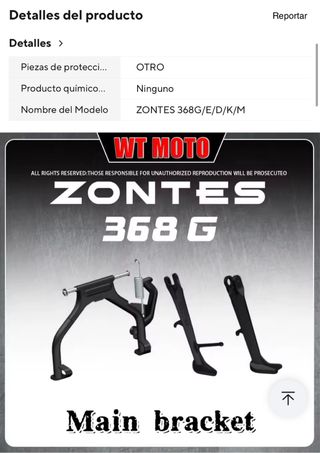 Pata de cabra mas corta que la original para Zontes 368 G. Perfecta para los que le bajan la altura a la moto, para que no se quede tan vertical, con el riesgo de que se vuelque. Nueva.