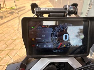 Moto Zontes 368 G estilo adventure. - Kilometraje total: 7113 km. - Temperatura: 71 °C. - Voltaje: 12.3 V. - Autonomía: 70 km. - Presión de neumáticos: 2.3 bar. - Temperatura exterior: 20 °C.