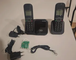 Conjunto de teléfonos fijos de la marca Alcatel. - Color negro. - Incluye base de carga. - Dos terminales. - Adaptadores de corriente. - Pilas recargables.