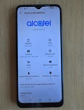 Teléfono móvil Alcatel 3x con pantalla de 6.53 pulgadas. - Cámara trasera de 16 MP, 5 MP, 2 MP, 2 MP, 8 MP. - Batería de 5000 mAh. - Versión de Android 10. - Nivel de parche de seguridad de Android: 5 de mayo de 2022. Defecto tal y como se aprecia en imágenes, es el protector