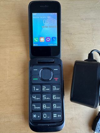 Teléfono móvil plegable en perfecto estado. Es de color negro y tiene una cámara. Funciona correctamente. - Diseño plegable. - Incluye cámara. - Pantalla clara y nítida.