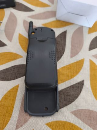 Teléfono de hace diez años. Tiempo que lleva guardado en una caja y parece que se ha dañado un poco la tapa de abajo. Funcionaba cuando lo dejamos de usar. Pestañas que va a la pared rota.
