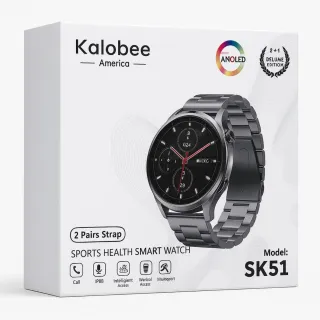 Reloj inteligente Kalobee SK51 con pantalla AMOLED.. - Incluye 2 pares de correas. - Funciones de salud y deporte. - Resistente al agua IP68. - Acceso inteligente. - Múltiples modos deportivos.