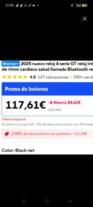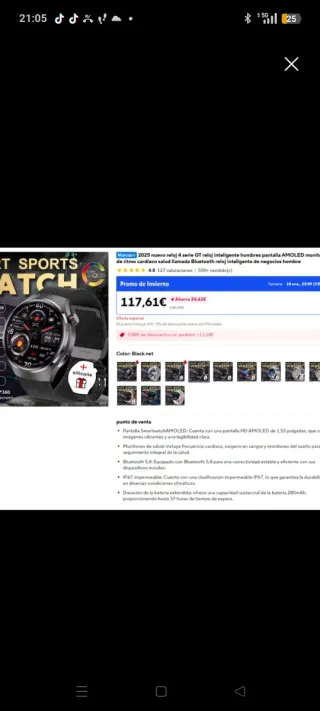 Smartwatch elegante y moderno en color negro. - Pantalla AMOLED HD de 1,53 pulgadas. - Monitor de salud con frecuencia cardíaca y oxígeno en sangre. - Bluetooth 5.4 para conectividad estable. - Clasificación impermeable IP67. - Batería de 280mAh con hasta 1 semana de uso - Precio original: Casi 120€