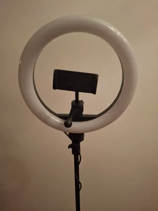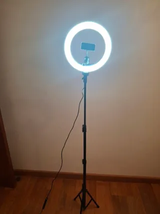 Aro de luz LED con soporte ajustable. - Diámetro del aro: 10 pulgadas. - Incluye trípode. - Cable de alimentación.