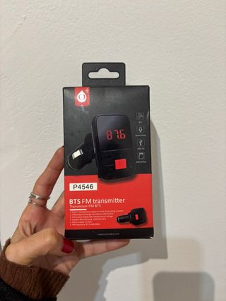 Transmisor FM para coche con función manos libres. - Soporta llamadas manos libres. - Puerto USB para cargar smartphones (DC 5V/1A). - Pantalla LED que muestra frecuencia y voltaje. - Compatible con MicroSD. - Alimentación: 12-24V. - Rango de frecuencia FM: 87.5-108MHz.