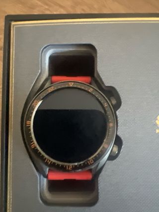 Reloj inteligente Huawei Watch GT 46mm con correa roja y detalles negros. - Esfera redonda. - Bisel con detalles. - Correa de silicona.