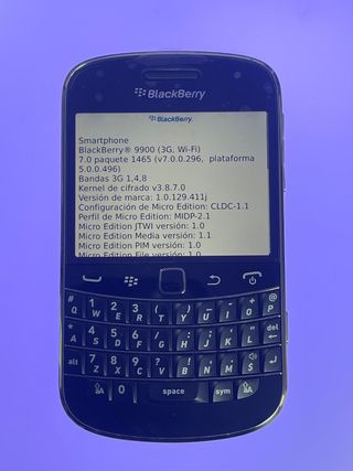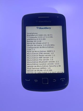 Smartphone BlackBerry 9380 con conectividad 3G y Wi-Fi. - Versión de software: 7.1 paquete 1133 (v7.1.0.336). - Plataforma: 9.32.0.88. - Bandas 3G: 1,4,8. - Kernel de cifrado: v3.8.7.1. - Versión de marca: 1.0.129.3855s. - Configuración de Micro Edition: CLDC-1.1. - Perfil de Micro Edition: MIDP-2.1. - Versión de Micro Edition JTWI: 1.0. - Versión de Micro Edition Media: 1.1. - Versión de Micro Edition PIM: 1.0. - Versión de Micro Edition File: 1.0. - Versión de Micro Edition Bluetooth: 1.1. - Versión de Micro Edition Location: 1.0.1. - Versión de Micro Edition Security y de Trust Services (APDU): 1.0. - Versión de WLAN: 4.5.0.189