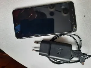 Teléfono marca BQ con pantalla de 5.5”. Batería de 3400mAh, 4Gb de RAM y 64gB de almacenamiento (con posibilidad de añadirle una tarjeta de memoria microSD), desbloqueo por huella, NFC y acepta doble SIM. Tiene una raja en la pantalla que no afecta a su funcionamiento ya que es el cristal exterior. Incluye cargador original de carga rápida y una funda sin estrenar