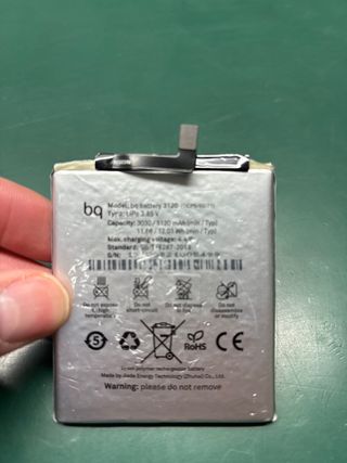 Batería recargable de polímero de litio para dispositivos bq. - Modelo: bq battery 3120 (CPS/50/71) - Tipo: LiPo 3.85 V - Capacidad: 3030/3120 mAh (mín/Típ) - Voltaje de carga máx.: 4.4 V - Fabricada por Jiade Energy Technology (Zhuhai) Co., Ltd.