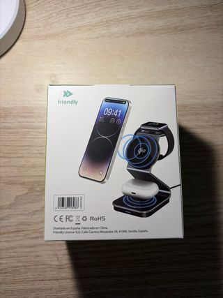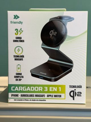Cargador inalámbrico 3 en 1 de la marca Friendly. Permite cargar varios dispositivos a la vez. Nuevo. Sin abrir. - Carga simultánea de 3 dispositivos. - Tecnología MagSafe. - Compatible con iPhone, AirPods y Apple Watch.