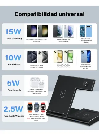 Base de carga inalámbrica 3 en 1 para dispositivos móviles y reloj. - Diseño elegante en color negro. - Carga rápida para tus dispositivos compatibles. - Incluye soporte para teléfono, reloj y base para auriculares. Este soporte de carga ultrarrápida es la solución perfecta para tu ecosistema Apple. Olvídate de los cables: carga simultáneamente tu iPhone (desde el 8 hasta el 16 Pro/Max), tu Apple Watch (Series 2 a 10/SE) y tus AirPods. Su diseño elegante y compacto lo hace ideal para tu mesita de noche u oficina