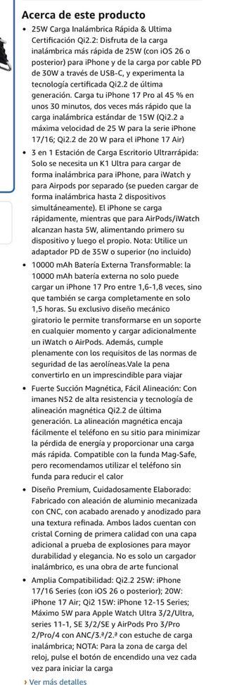 TODOS NUESTROS PRODUCTOS SON COMPLETAMENTE NUEVOS Y CON DESCUENTOS BRUTALES. IMPORTANTE: 1. Precio Fijo no negociable. No respondemos a mensajes de regateo. 2. No comunicamos fuera de la plataforma: no pidan eMail o teléfono. DESCRIPCION COMPLETA EN LA SEGUNDA IMÁGEN KU XIU K1ULTRA Qi2.2 25W Magnético Cargador Inalámbrica, 10000mAh Power Bank, 3 in 1 Pieghevole Bateria Externa Carga Rapida, USB-C Bateria Portatil para iPhone 17/16, para iWatch, para Airpods - Diseño elegante en color negro. - Compatible con tecnología Qi2.2. - Incluye soporte integrado.
