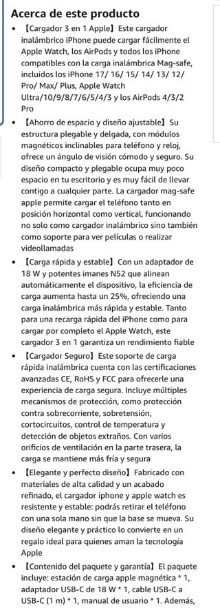 TODOS NUESTROS PRODUCTOS SON COMPLETAMENTE NUEVOS Y CON DESCUENTOS BRUTALES. IMPORTANTE: 1. Precio Fijo no negociable. No respondemos a mensajes de regateo. 2. No comunicamos fuera de la plataforma: no pidan eMail o teléfono. DESCRIPCION COMPLETA EN LA SEGUNDA IMÁGEN QTlier 3 en 1 Cargador inalámbrico Compatible con mag-Safe, 18W Estación de Carga Rápida Cargador Inalámbrico para iPhone 17/16/ 15/14/ 13/12, AirPods Apple Watch, Adaptador Incluido - Negro - Diseño elegante en color gris. - Soporte para iPhone. - Base para Apple Watch. - Compartimento para AirPods.