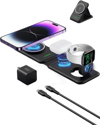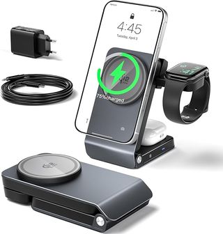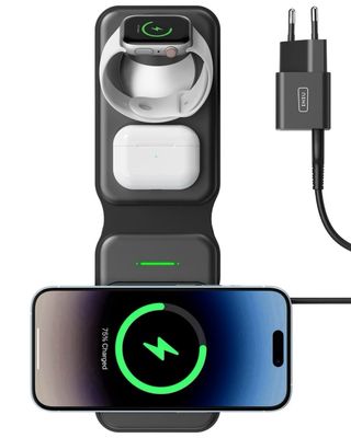 Este cargador inalámbrico es plegable y permite cargar hasta tres dispositivos a la vez. - Diseño compacto y portátil. - Superficie de carga para iPhone. - Base para Apple Watch. - Compartimento adicional para AirPods o similar.