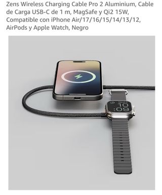 Cable de carga inalámbrica Zens Wireless Charging Cable Pro 2 en acabado aluminio negro. - Cable USB-C de 1 m. - Compatible con MagSafe y Qi2 15W. - Diseñado para iPhone (modelos 17/16/15/14/13/12), AirPods y Apple Watch.