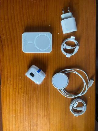 Pack de accesorios para dispositivos móviles. - Cargador de pared blanco. - Cable USB-C a USB-C. - Cable USB-A a Lightning. -Cable Tipo -C - Base de carga inalámbrica redonda. - Adaptador de corriente blanco. -Airpods con marcador de bateria -bateria externa magnetica