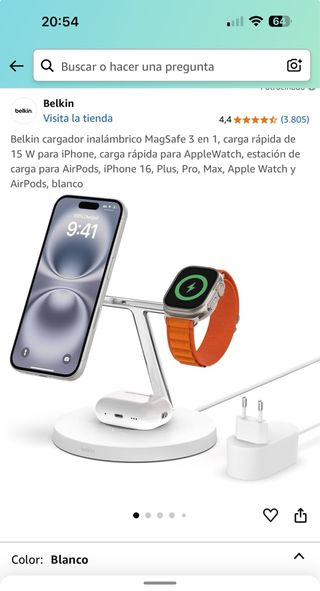 Belkin Cargador Inalámbrico 2 en 1 con MagSafe (Carga Rápida de 15 W, Soporte de Carga para la Serie iPhone 16.15, 14, 13, AirPods y Otros Dispositivos con MagSafe, Adaptador de Corriente Incluido), Blanco. Tengo factura pero no su caja.