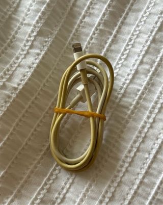 Cable cargador para iPhone y AirPods de Apple. Funciona perfectamenete, lo unico se le ha puesto un poco color anarillento. - Compatible con iPhone y AirPods.