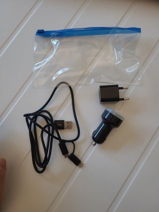 Cable de carga móvil 3 en 1 con adaptador para coche. - Incluye conectores USB-C, Lightning y Micro USB. - Adaptador de coche con dos puertos USB.