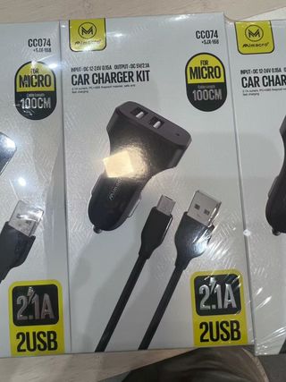 Vendo dos cargadores de coche Mimacro nuevos, sin abrir. paquete de 12 unidades - Kit cargador coche con cable micro USB de 100cm. - Salida: 5V/2.1A. - Entrada: 12-24V 0.15A. - Material ignífugo PC+ABS. - Carga rápida y segura.