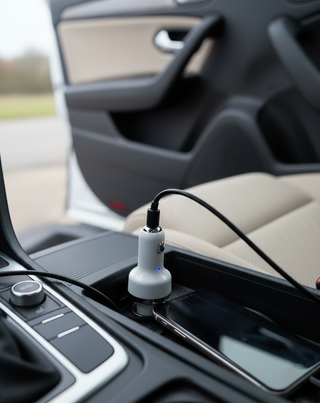Adaptador de coche USB compacto para cargar tus dispositivos. - Diseño mini y ligero. - Compatible con iPad y iPhone. - Se conecta al encendedor del coche.
