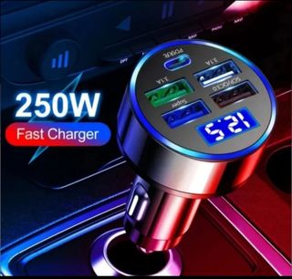 Cargador rápido para coche con 5 puertos y pantalla digital. 250W de potencia máxima. Pantalla LED que muestra el voltaje. Puertos: PD, QC3.0, USB C. Sin estrenar.