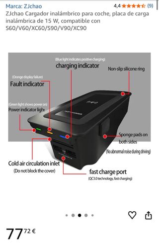Cargador inalámbrico para coche, diseñado para modelos Volvo. - Potencia de 15W. - Compatible con S60/V60/XC60/S90/V90/XC90. - Incluye puertos USB adicionales.