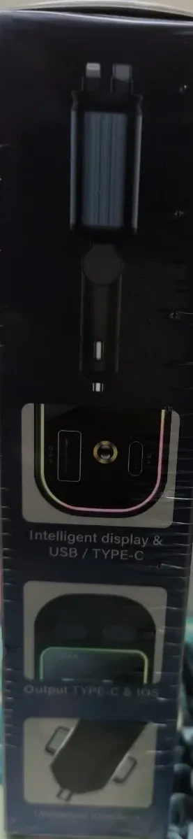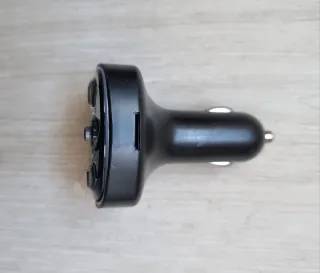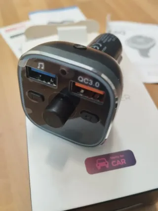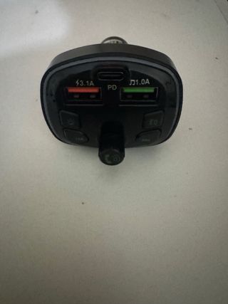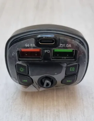Dispositivo multifunción para el coche que permite cargar dispositivos y escuchar música. Puertos USB: 1x PD (Type-C) y 1x USB-A (4.8A). Transmisor FM para música.Botones de control: Este es un transmisor FM Bluetooth para coche. Permite transmitir audio desde un teléfono u otro dispositivo a la radio del coche a través de una frecuencia FM, ideal para vehículos sin Bluetooth o entrada auxiliar. Conectividad: Se conecta al encendedor de cigarrillos del coche y se enlaza al teléfono mediante Bluetooth. Puertos de carga: Cuenta con múltiples puertos USB, incluyendo un puerto PD (Power Delivery) y puertos USB-A con salidas de 4.8A