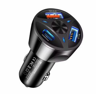 Cargador para coche con múltiples puertos para tus dispositivos. - Puerto USB-C PD (Power Delivery). - Puerto USB-A con carga rápida de 3.1A. - Puerto USB-A adicional de 1.0A. - Botones para control de música y ecualizador.