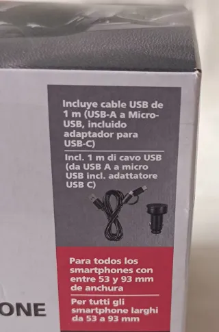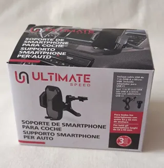 Soporte de smartphone para el coche, marca Ultimate Speed. • NUEVO, SIN ABRIR. - Compatible con smartphones de 53 a 93 mm de ancho. - Incluye cable USB de 1 m (USB-A a Micro-USB, incluido adaptador para USB-C). - Cargador de 12 V /24 V con conexión de carga USB-A y USB-C. - Giratorio e inclinable aprox 40°. - Sujeción sencilla a la ranura de ventilación. - Tecla de liberación rápida del smartphone.