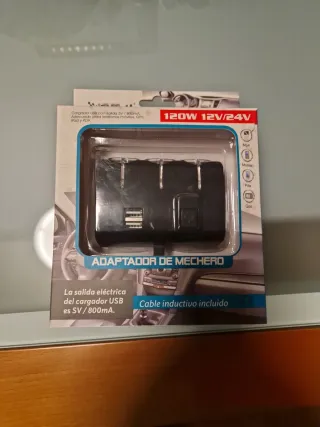 Adaptador de mechero para coche con múltiples puertos USB. - Salida eléctrica del cargador USB: 5V / 800mA. - Voltaje de entrada: 12V/24V. - Potencia máxima: 120W. - Incluye cable inductivo.