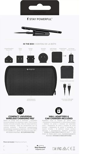 Con el kit de viaje global Charge Stream, puedes llevar la comodidad de la carga inalámbrica contigo, incluso cuando viajas al extranjero. Cinco adaptadores de enchufe de CA intercambiables te permiten cargar tu smartphone con Qi de forma inalámbrica en América del Norte, Europa, Australia, Reino Unido y China. El kit de viaje también viene con un cable micro-USB, un adaptador de coche, el Charge Stream El Pad Mini incluido en el kit de viaje está diseñado para funcionar sin problemas con la última tecnología Qi. Simplemente coloca tu teléfono en la superficie antideslizante y la almohadilla comienza a ofrecer una carga de 5W.