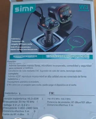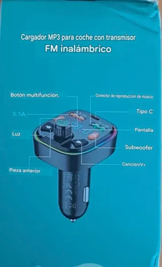Transmisor FM y cargador MP3 para coche con función manos libres. - Sonido HiFi con graves profundos. - Micrófono incorporado para llamadas. - Cancelación de ruido CVC. - Reproducción de música móvil vía A2DP. - Emparejamiento automático al encender.