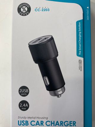 Cargador de coche con dos puertos USB para cargar tus dispositivos mientras viajas.