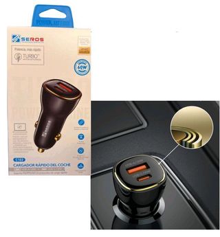 Cargador de coche SEROS de 60W, con tecnología Turbo para una carga rápida. Es de color negro con detalles dorados, y tiene un diseño elegante y compacto. - Carga rápida de 60W. - Tecnología Turbo. - Puertos USB-A y USB-C. - Diseño elegante y compacto.
