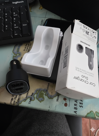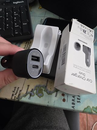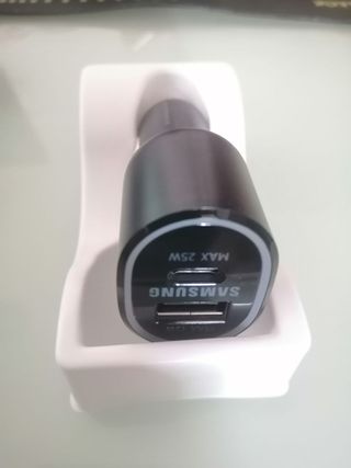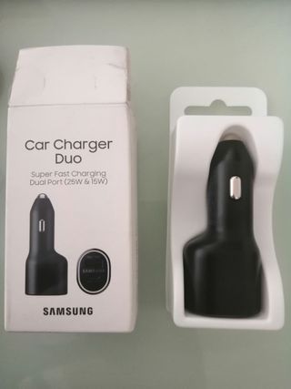 Vendo cargador Samsung de 65W con tres puertos (USB-C x2, USB-A) y un cargador de coche con dos puertos (45w). Ambos cargadores están en perfecto estado. - Incluye un adaptador de corriente de 65W con tres puertos. - Incluye un cargador de coche con dos puertos y carga rápida. - Perfectos para cargar tus dispositivos de forma rápida y eficiente.