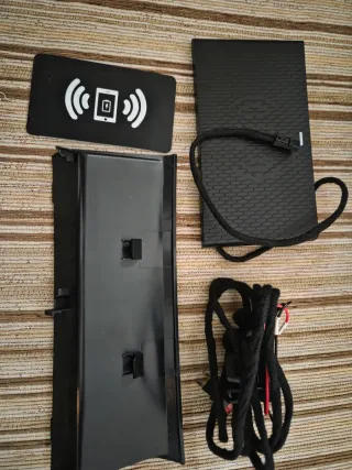 Kit de carga inalámbrica para coche, incluye base y accesorios. - Base de carga con superficie texturizada. - Tarjeta con símbolo de carga inalámbrica. - Cableado conector.