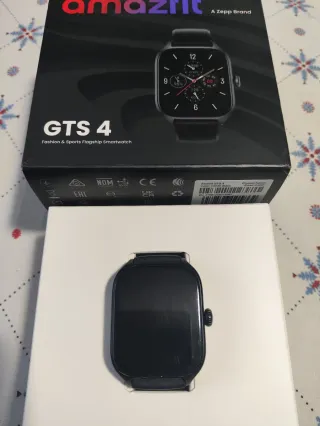 Smartwatch Amazfit GTS 4 en color negro. Incluye caja, dos cargadores y varias correas de cambio. En perfecto estado. Con las marcas del uso diario. La batería con todos los sensores y las notificaciones dura una semana.