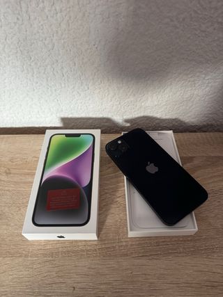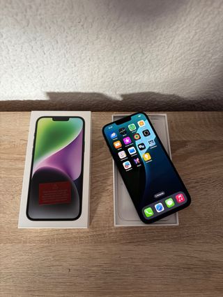 Teléfono móvil iPhone 14 con 128GB de almacenamiento. Se vende por cambio por un modelo superior,el movil esta en perfecto estado compadro hace poco mas de 1 año y con 86% de salud de bateria.Se vende con caja,funda y cargador.