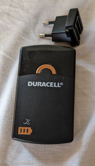 batería externa USB Duracell con poco uso capacidad 1800 mAh al tener enchufe propio de quita y pon, se puede usar también como cargador