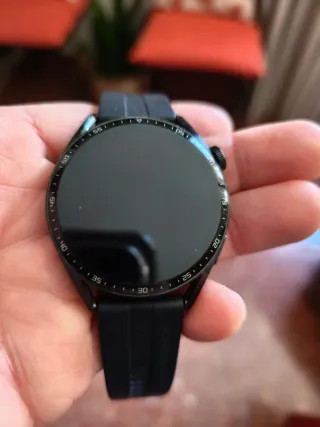 Reloj inteligente Huawei GT3 en color negro. - Diseño elegante y moderno. - Correa cómoda y duradera. Tiene bastante uso, la batería le dura 3 días y tiene desgaste. Lo entrego con cargador original y no tiene caja. No respondo ofertas ridículas.