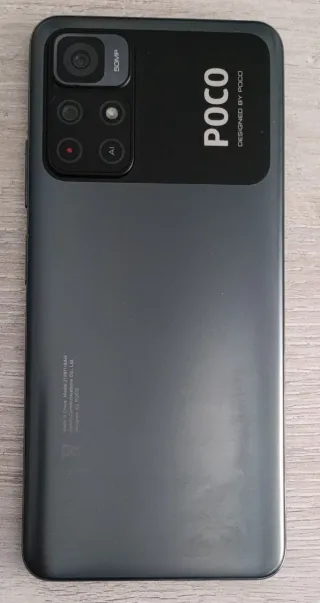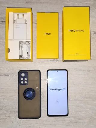 Teléfono móvil Xiaomi Poco M4 Pro 5G con acabado en gris y detalles en negro. Incluye cargador y cable. Pantalla, cámara y batería en perfecto estado. Lleva puesto protector de pantalla. Cámara de fotos 50MP - Funda protectora con anillo. - Cargador rápido de 33W. - Cable USB-C.