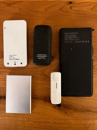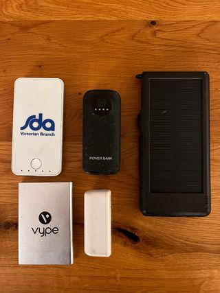 Lote de cargadores portátiles. - Cargador blanco marca SDA Victorian Branch. - Cargador negro marca Power Bank. - Cargador plateado marca Vype. - Cargador blanco pequeño.