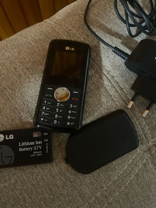 Teléfono móvil vintage de la marca LG en color negro. Incluye batería y cargador. - Batería de Ion Litio 3.7V 900mAh LGIP-430A. - Cargador de pared con cable.