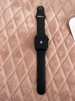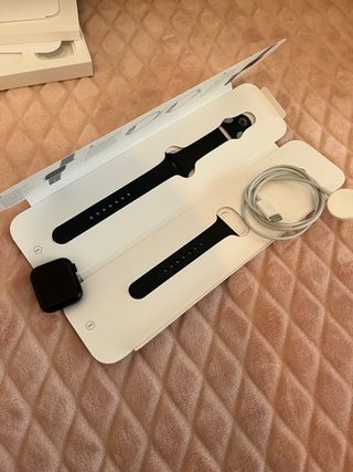 Reloj inteligente Apple Watch SE de 40 mm en aluminio negro. Incluye cargador y correas. - Caja de aluminio. - Correa deportiva negra. - Cargador magnético. - Se puede meter en el agua hasta una profundidad de 50 M. Lleva a mayores una correa de color verde comprada en Shein. También lleva en la caja dos correas de diferentes tamaños; una M/L y otra S/M. Estéticamente en la pantalla está un poco rayado, ya que nunca le he puesto proteccion, pero funciona perfectamente como el primer día. Tiene un 82% de salud de batería.