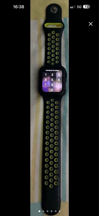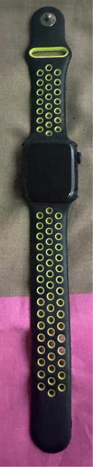 Reloj inteligente Apple Watch SE de 40 mm en color negro, con una llamativa correa de silicona perforada en amarillo. - Diseño deportivo y moderno. - Correa con múltiples orificios para ventilación. No tiene ningun rasguño ni golpe dado. -Incluye cargador,caja y manuales. -Salud de la bateria 88%.