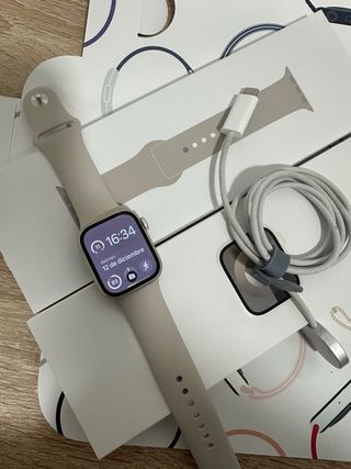 Apple Watch Series 9 en color Starlight. 41 mm. GPS + Cellular: Incluye cargador. Comprado en diciembre 2023. La correa es la original y está sin usar. Estado de batería: 97%