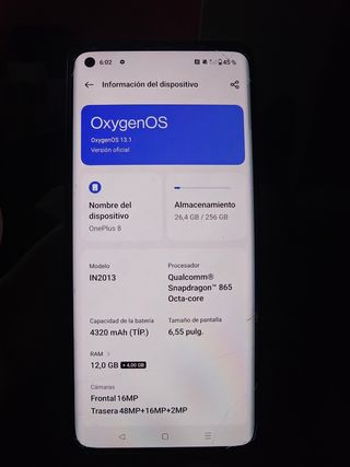 OnePlus 8 con 256GB de almacenamiento interno. El teléfono se encuentra en perfecto estado. - Modelo: IN2013 - Procesador: Qualcomm Snapdragon 865 Octa-core - Pantalla: 6,55 pulgadas - Batería: 4320 mAh - Cámara trasera: 48MP+16MP+2MP - Cámara frontal: 16MP No tengo la caja pero si la funda original y el cargador. Tengo algun cristal templado que lo doy con el móvil y alguna funda más.